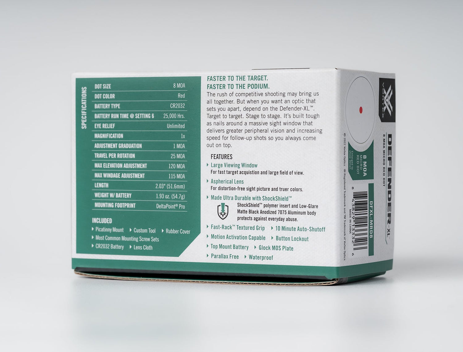 Z zasnovo okoli izjemno širokega okna za hitrejše prehode med tarčami je Defender-XL robustna, za tekmovanja pripravljena mikro rdeča pika, ki odlično deluje tudi na službenih ali streliščnih pištolah—ter na karabinih/šibrovkah z uporabo priložene Picatinny letve.